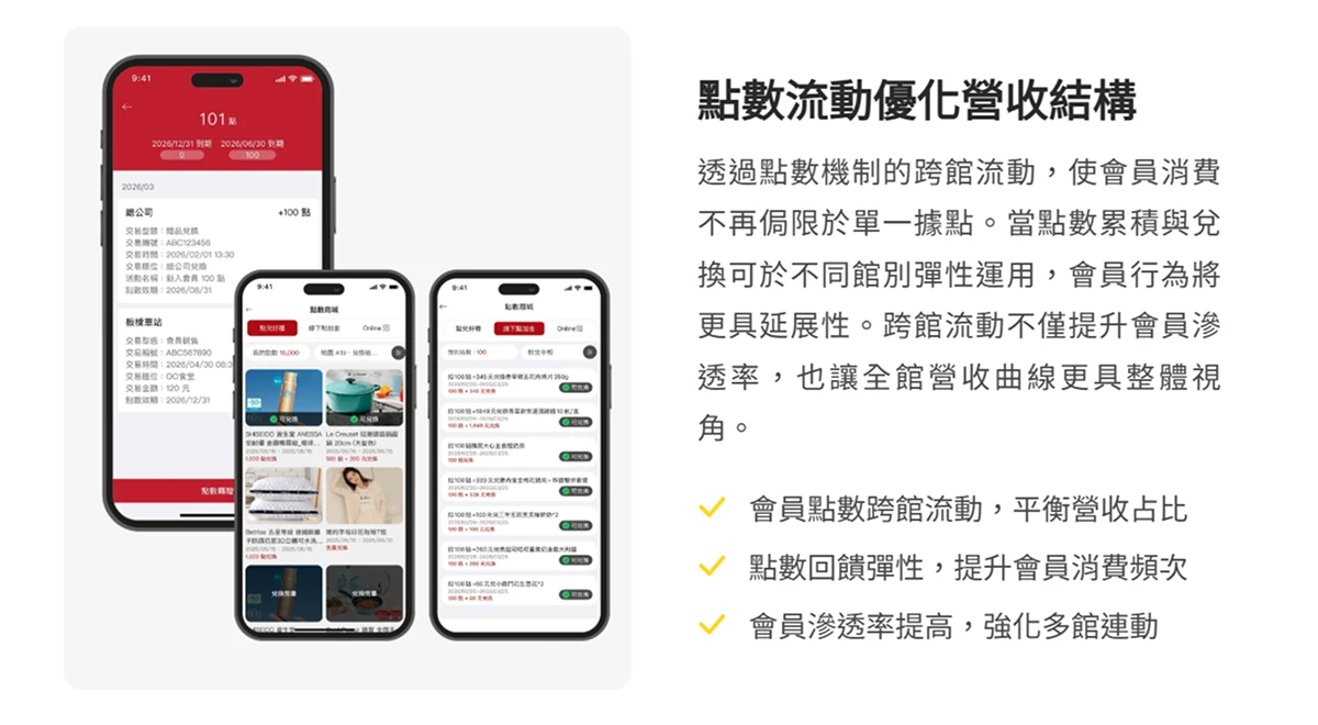 ( 圖:會員點數 讓每次消費的價值得以延續,會員更有 忠誠度,跨館點數共用 也讓消費者更有 回訪、積點的動機 )