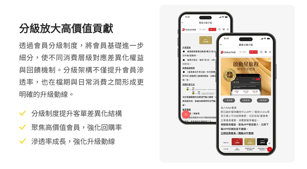 若消費閉環讓來客願意停留,分級制度 則決定了不同客群在營收占比中的角色。環球購物中心並未只將會員分級視為象徵性的權益差異,而是透過客單價與 消費頻次 的實際差異,重新設計升級動線。當 高價值會員 在營收結構中的占比逐步清晰,回購率 與客單價結構的變化,便能成為決策討論的核心指標。