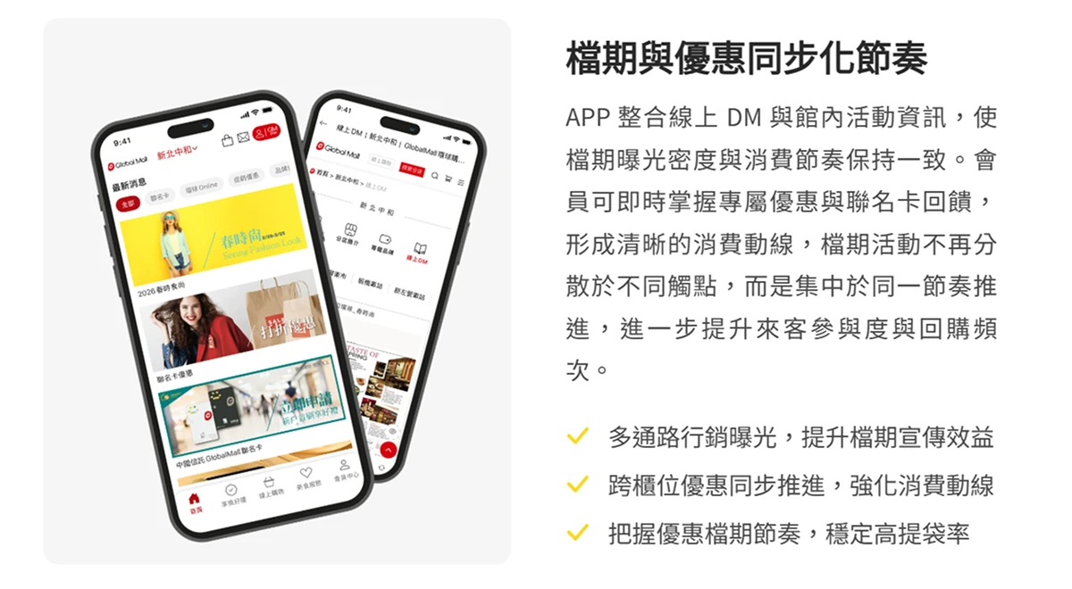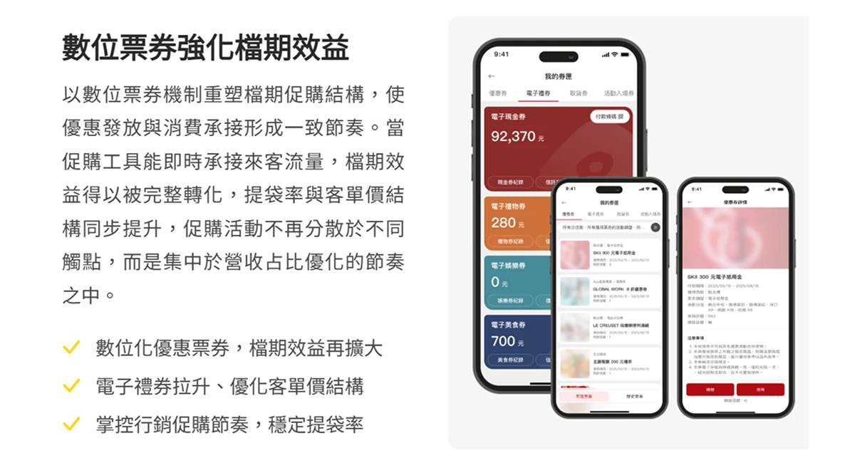 在多館經營的情境下,檔期始終是百貨營收的重要節奏。然而,當場域已具備軌道經濟所帶來的穩定流量,檔期若僅停留在促銷活動本身,往往難以持續放大營收占比。環球購物中心在檔期設計上逐步將 數位票券 納入營收模型的一環,使優惠發放、權益承接與消費轉換透過會員 APP 形成一致節奏。
