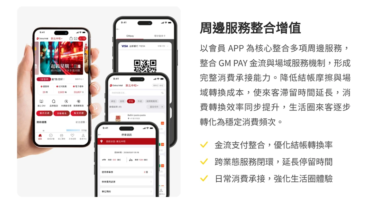 ( 圖:透過 APP 使用餐飲訂位、停車優惠還有 GM PAY 金流,環球購物中心將周邊服務整合,為顧客提供成一站式的 顧客體驗 )