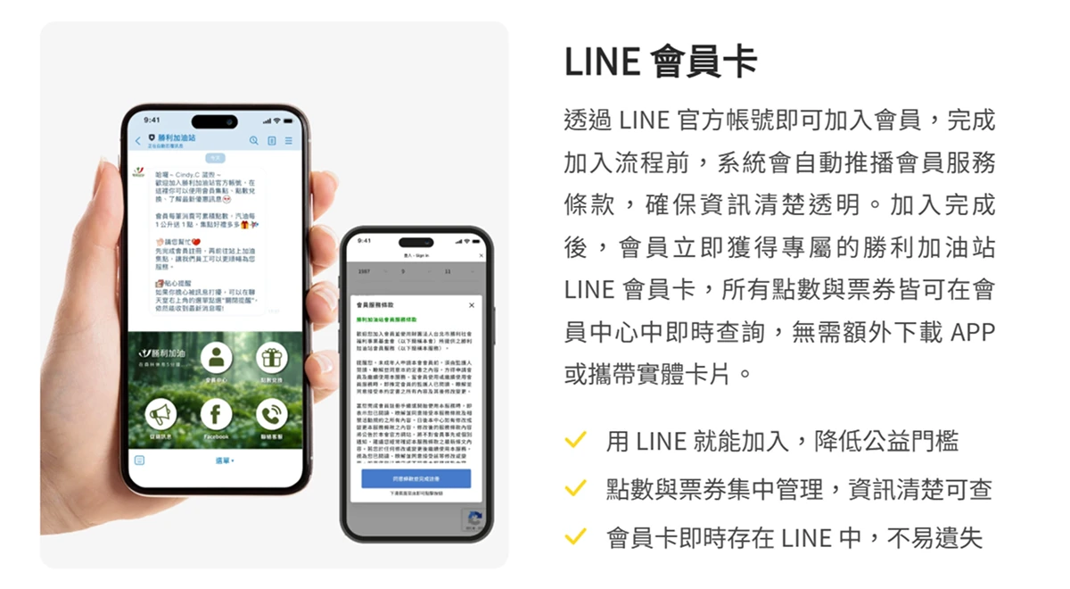 在實際運作上,LINE 會員卡 成為勝利加油站與顧客之間的重要橋樑。顧客只要透過 LINE 即可加入會員,系統會在加入前自動推播會員服務條款,確保資訊清楚透明。完成後,專屬的會員卡即存在於 LINE 中,無須攜帶實體卡片。