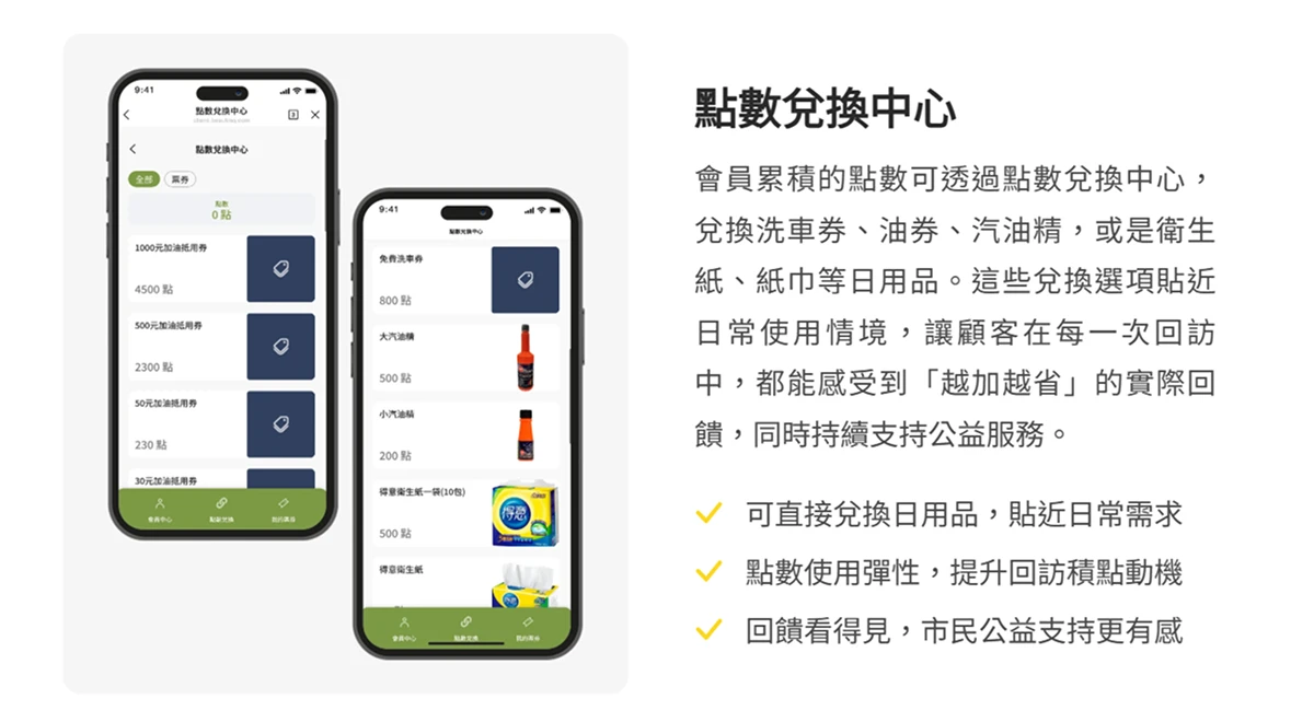 當點數能被使用,回饋才真正完成。勝利加油站透過點數兌換中心,提供洗車券、油券等 優惠券,還有汽油精,或衛生紙、紙巾等日用品作為兌換選項。這些品項皆貼近日常使用情境,讓顧客在每一次回訪加油站時,都能感受到「越加越省」的實際好處。