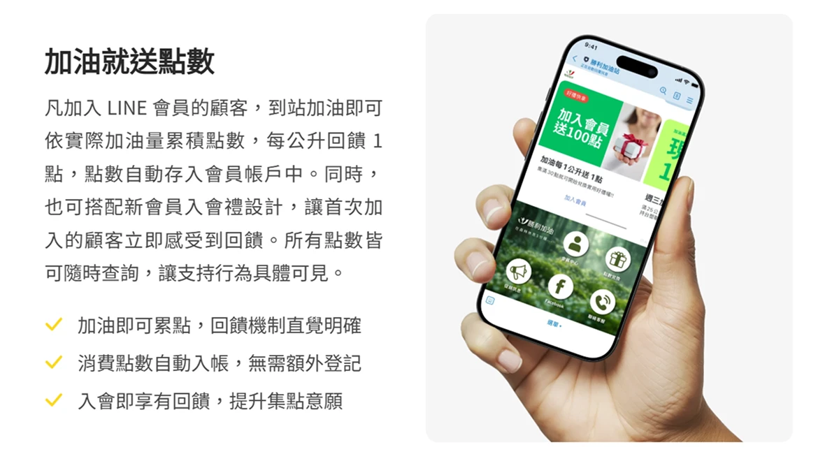在點數設計上,勝利加油站採取直覺且透明的方式。只要成為 LINE 會員,到站加油即可依實際加油量 累積點數,每公升回饋 1 點,點數會自動存入會員帳戶 ( 集點卡 ) 中。這樣的加油優惠設計,避免了人工登記的不便,也讓顧客能即時感受到回饋。