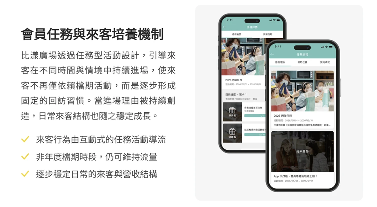來客的 回訪行為 主要受自發性需求驅動,這類回訪雖然真實,卻難以被預測與設計,使非檔期時段的來客密度往往呈現不確定性。比漾廣場透過 任務型活動設計,在自發性來客節奏之外,建立一套可被主動觸發的回訪誘因。來客透過 APP 接收特定時間段的消費任務,完成後即獲對應的回饋獎勵,使「回到比漾廣場」的念頭透過任務架構被刻意創造,並在適當時機傳遞給目標來客。
