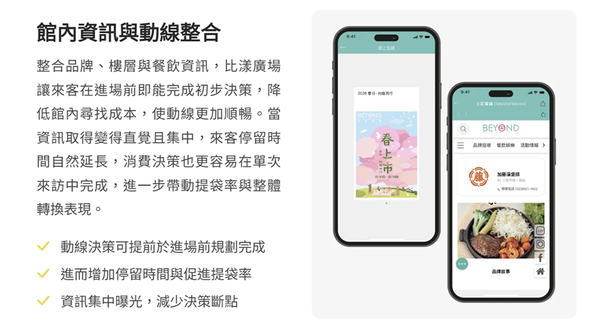 比漾廣場將品牌樓層查詢、餐飲資訊、當期活動、電子 DM 與停車場即時車位整合於同一 APP 入口,讓來客在進場前即能完成初步決策,縮短動線規劃的時間成本,使停留時間更集中地轉化為實際消費行為。原本可能只為單一需求而來的客群,因為一次看見餐廳資訊與當日優惠,便 自然延伸消費範圍,提袋率在這種資訊整合之下被自然放大。APP 內直撥各專櫃服務專線的設計,更讓售前與售後的溝通門檻降低,進一步強化比漾廣場作為「生活圈一站式服務節點」的場域定位。