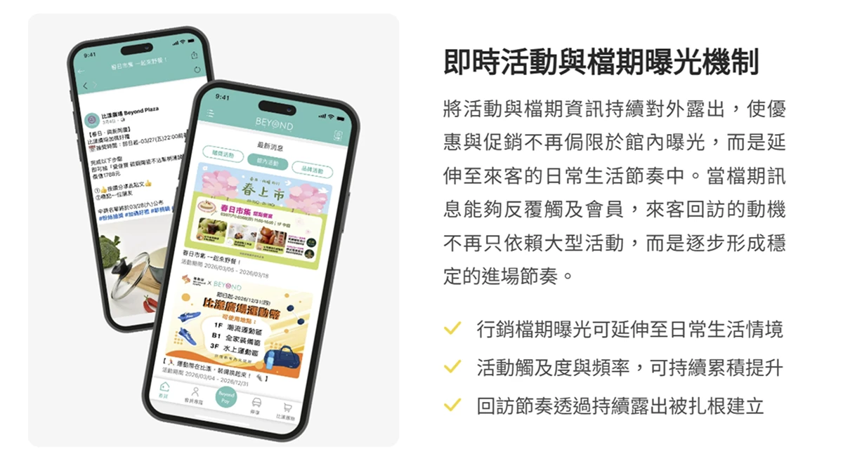 比漾廣場透過 APP 的 即時活動通知 與線上 DM,將檔期資訊的曝光時間點大幅提前。來客在日常使用手機的各個片段中,即可接收比漾廣場的優惠、品牌活動與精選選品內容,使「進場理由」在日常生活的數位接觸點上被持續維繫。當活動能在開始前 持續觸及 既有會員,進場率的轉換更有保障,來客流量也更可能呈現有節奏的穩定分布。這種節奏的可預測性,有助於比漾廣場在場域準備與人員配置上做出更精準安排,使行銷檔期的效益不再集中於短暫爆發,而是形成更具持久性的回訪動能。