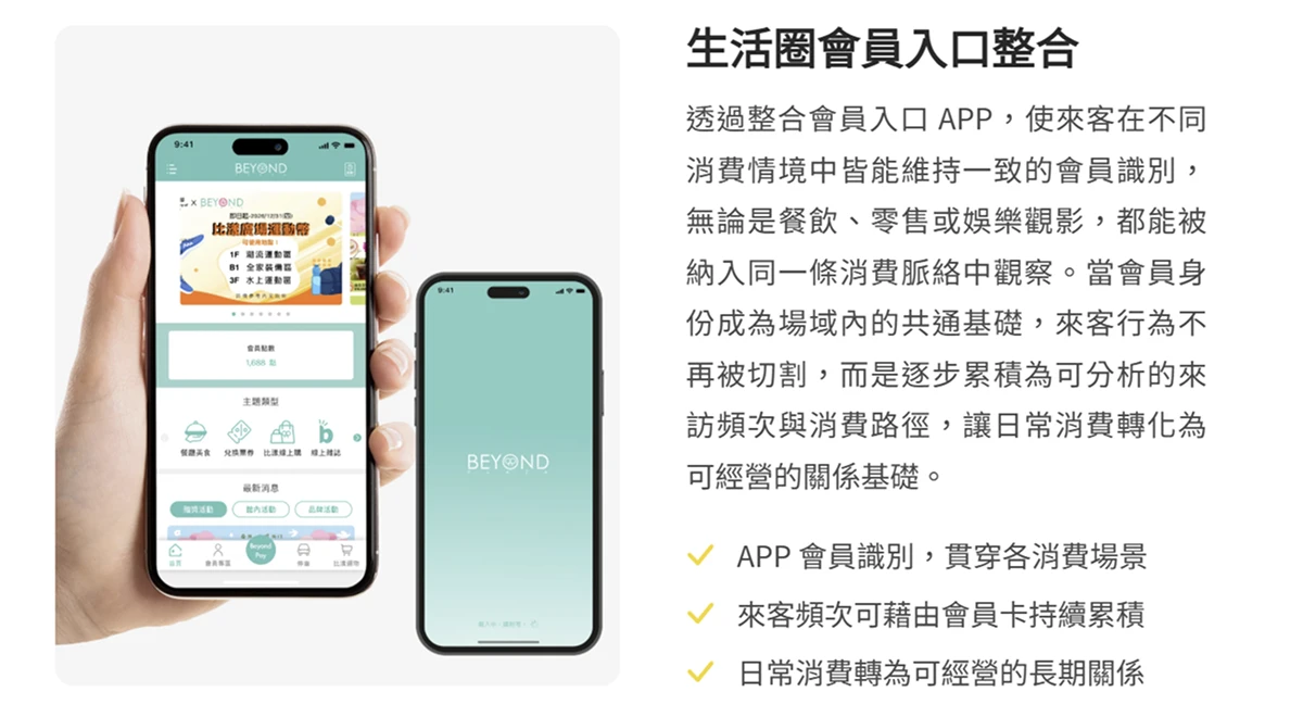 比漾廣場所實踐的,是一種從生活圈角度出發的百貨經營邏輯。透過 會員 APP 整合、館內資訊動線優化、即時活動曝光、點數回饋設計、支付串接 與 任務機制,讓每一次進場都在長期關係的累積中留下可延續的痕跡,使日常消費逐步沉澱為可被經營的會員資產。這套結構讓生活圈型百貨的成長不再只依靠外部流量刺激,而是建立在與在地居民之間長期積累的關係密度與信任基礎之上。