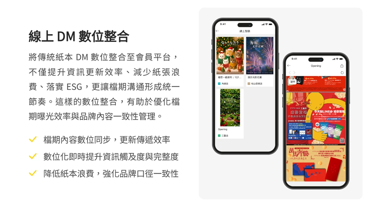 這些生活節奏本來就存在,商場未必能改變它們,但可以順著它們去規劃互動。當即時活動資訊曝光整合到會員 APP 這樣的入口裡,或是透過 APP 推播 進會員的視野中,會員在進站或出站的短暫時間,就能完成「今天要不要停一下」的決策。當線上 DM 成為日常資訊的一部分,顧客不需要現場翻找,也不需要等到看見紙本才想起來。當櫃位查詢變得清楚,顧客會更願意在有限時間內走得更深,因為路徑不再模糊。