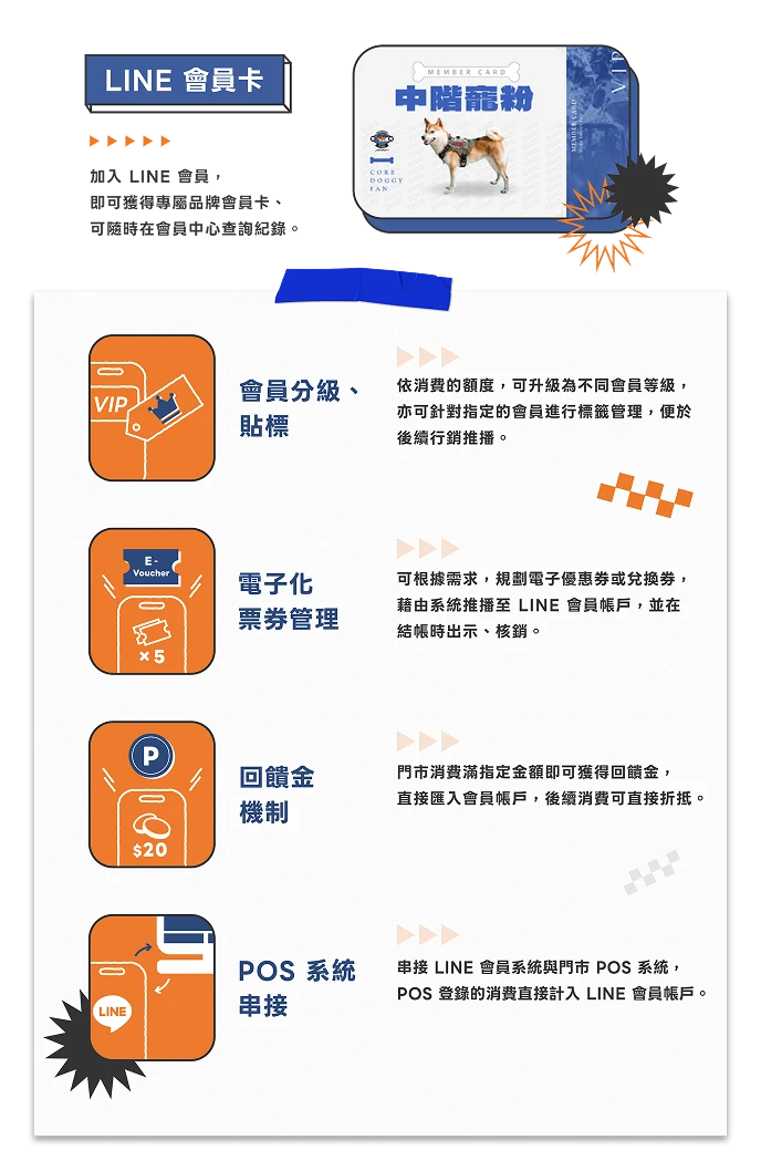 以 LINE 會員 作為數位身份識別主軸,結合 POS 消費數據,消費者無需下載額外 APP,即可完成所有會員註冊、消費查詢、回饋金 累積與各類寵物店用品消費紀錄。導入這套系統,不僅極大簡化了顧客與門市人員的作業流程,也滿足現代寵物用品店追求高效與便利的 會員經營 期望,推動寵物超市與寵物用品電商產業更進一步的數位升級。