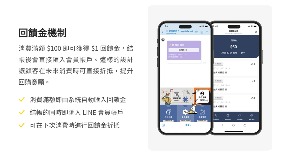 一名忠誠顧客是否願意推薦給親友,消費後是否能即時享有明確回饋是不可忽略的指標。寵你超市將消費 回饋金 自動化:只要在門市消費累積滿額即自動將回饋金匯入 LINE 會員帳戶,消費者下次可直接在結帳時折抵。