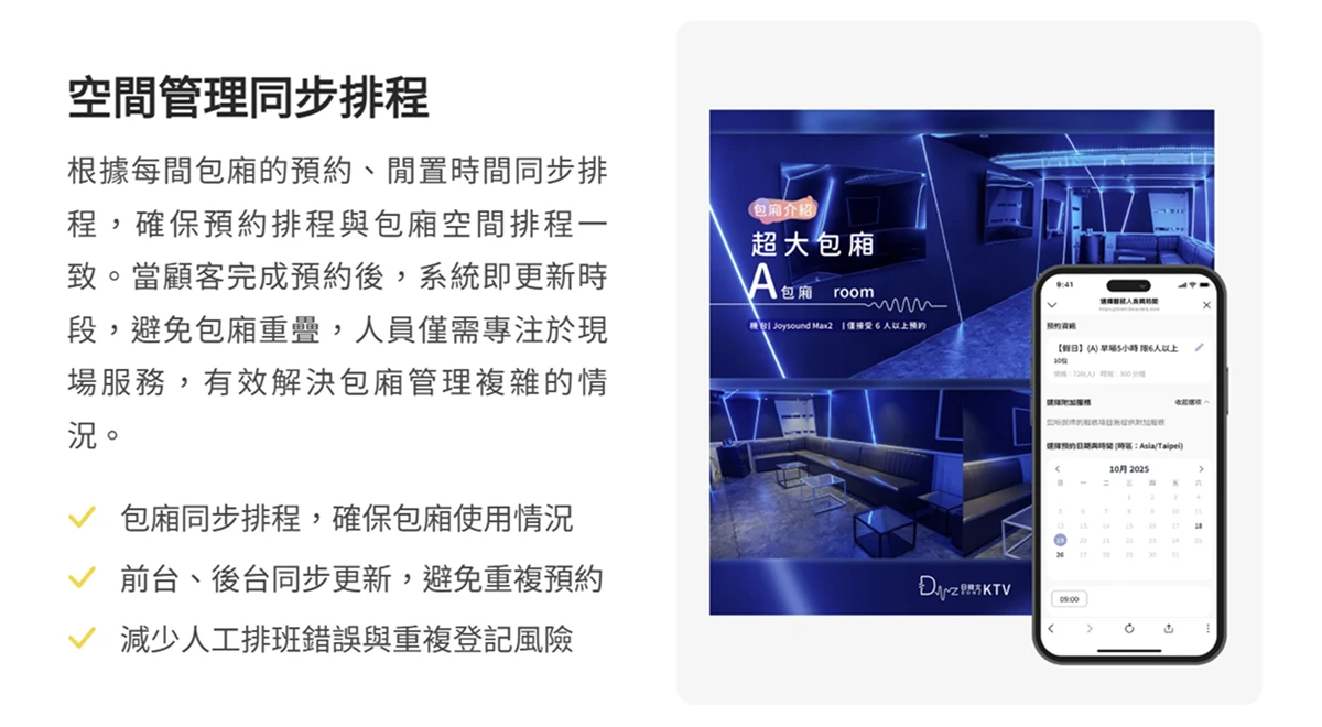 ( 圖:以包廂或設備為單位來管理預約,更貼合 KTV 的使用情境 )