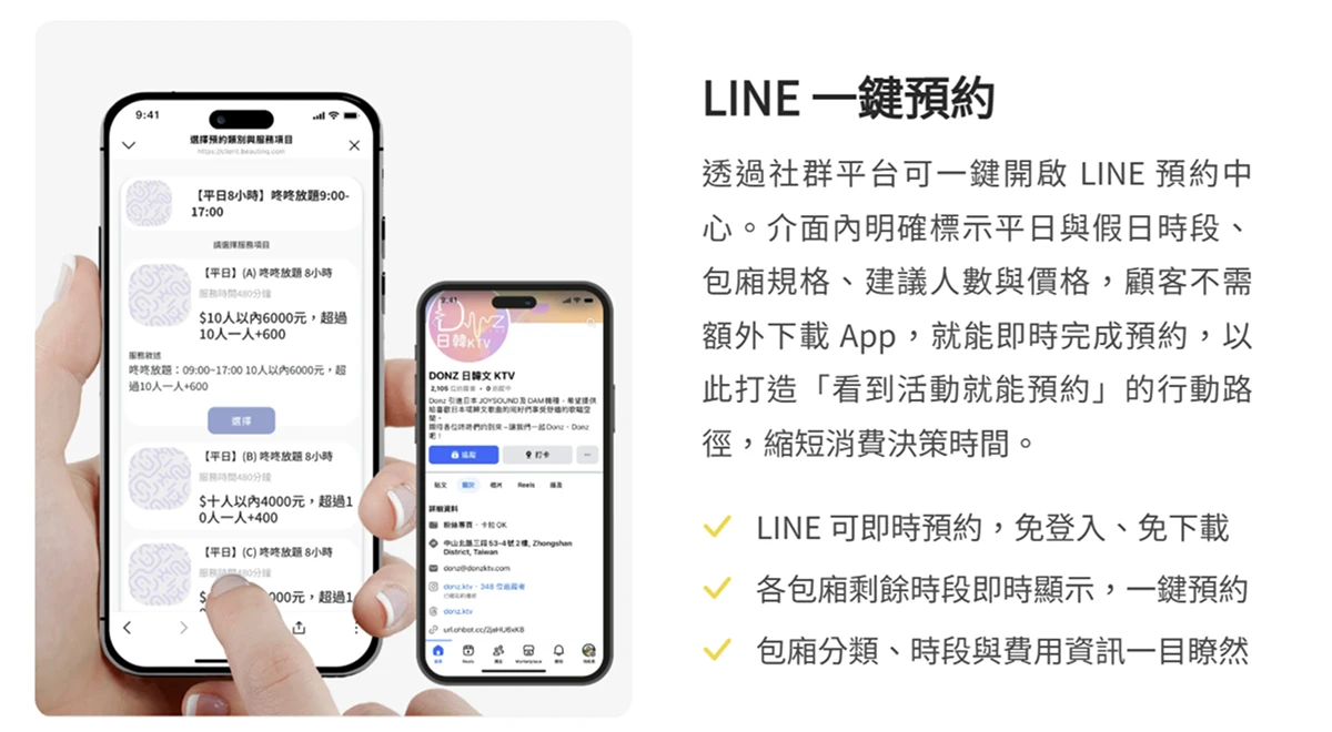 DONZ 的成功不只來自傳統 KTV 所注重的曲庫豐富或包廂唱歌氛圍強,還有他們懂得讓服務流程 數位化。許多顧客選擇這裡的理由很單純:「想唱韓國歌 KTV 時,能最快預約到位。」過去的 KTV 經營模式多半仰賴電話與現場管理,如今透過 LINE 預約 與 會員系統 整合,品牌能更靈活應對突發狀況。當顧客臨時更改時段或查詢包廂空位,只需打開 LINE,就能即時處理。