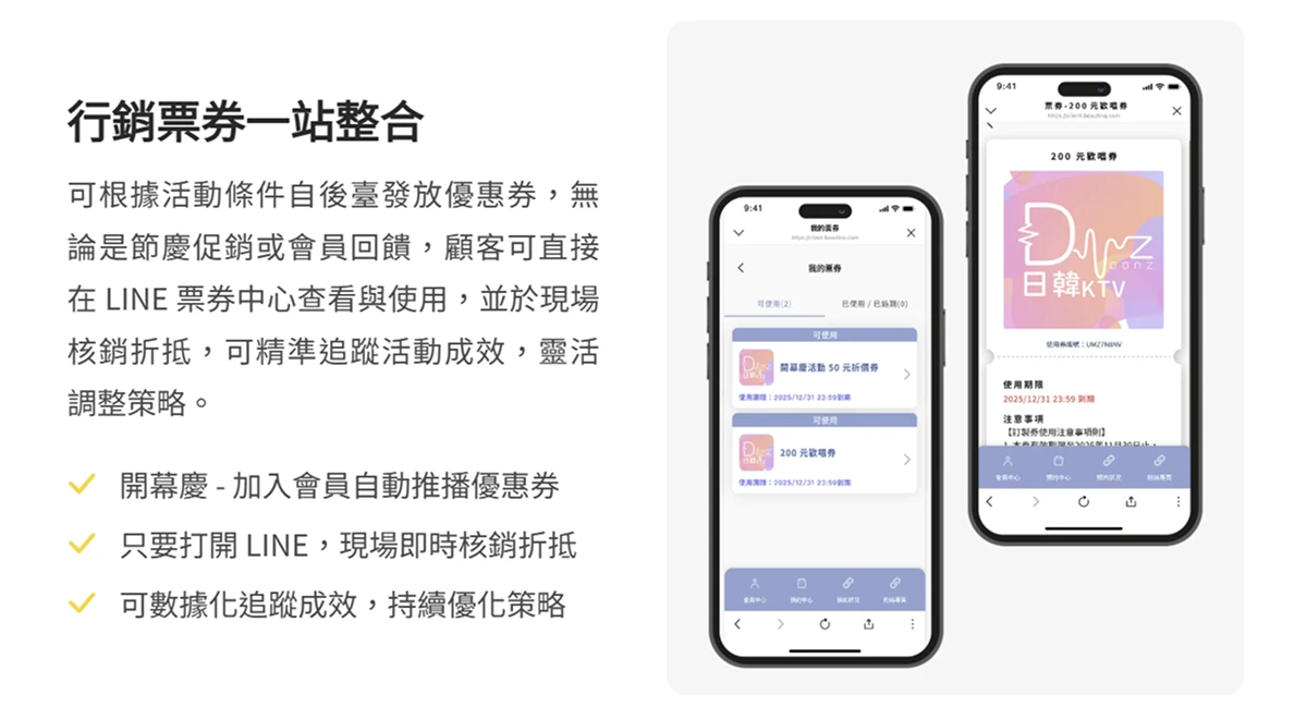 在節慶、開幕或周年慶期間,DONZ 經常會推出限定優惠。例:開幕慶 50 元折價券,會員只要完成 LINE 綁定,就能自動收到 優惠票券,並於現場核銷使用。這種設計讓品牌能即時回饋顧客,同時 促進再訪率。生活歐巴的 行銷票券系統 可根據不同條件自動發放、設定使用期限、追蹤兌換率。當會員於 LINE 內領取票券後,到店時由人員核銷即可。這樣的流程不僅節省人力,也避免紙本浪費,讓行銷推廣變得更靈活。