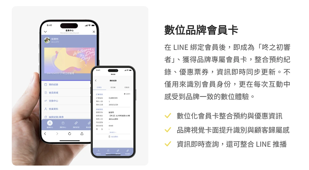 對許多 KTV 來說,顧客可能來唱一次就不再回訪。DONZ 為了解決這個問題,結合 LINE 會員機制,設計出具備品牌視覺的 數位會員卡,並賦予新進的 LINE 會員相當有意義的名號:「咚之初響者」。