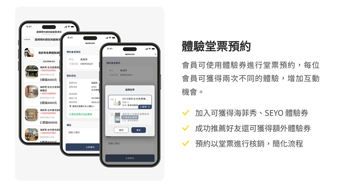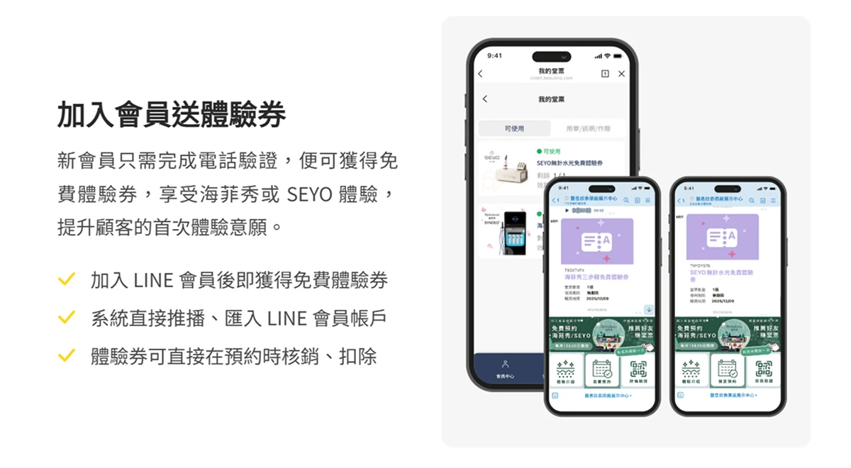 這套設計簡化了票券核銷,不需手動審核,預約體驗時即可直接抵用堂票,將 服務體驗 流程化繁為簡。會員參加海菲秀體驗、探索 SEYO 新技術或使用其他臉部美容儀器時,每一次的預約、核銷與餘額查詢,都透過 LINE 預約系統 快速完成。