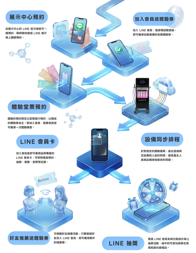 三是促進口碑及品牌成長。透過推薦送體驗券、數位抽獎等 行銷機制,會員可成為最強的社群推手,讓更多人認識醫思欣泰代理的水飛梭、海菲秀體驗、SEYO 等臉部美容儀器,加速消費者由體驗到轉單、由新客到 忠誠會員 的關鍵歷程。
