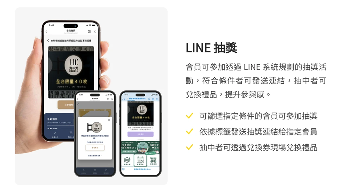 會員僅需於 LINE 點選活動網址完成抽獎,若中獎則可於指定現場或展示中心以數位抽獎兌換券兌換禮品或免費療程,無論是海菲秀體驗、SEYO 服務或其他臉部美容儀器體驗,業者可根據品牌策略彈性設計內容。透過頻繁的互動與 專屬回饋,有效提升會員活躍度,強化醫思欣泰品牌黏著度。