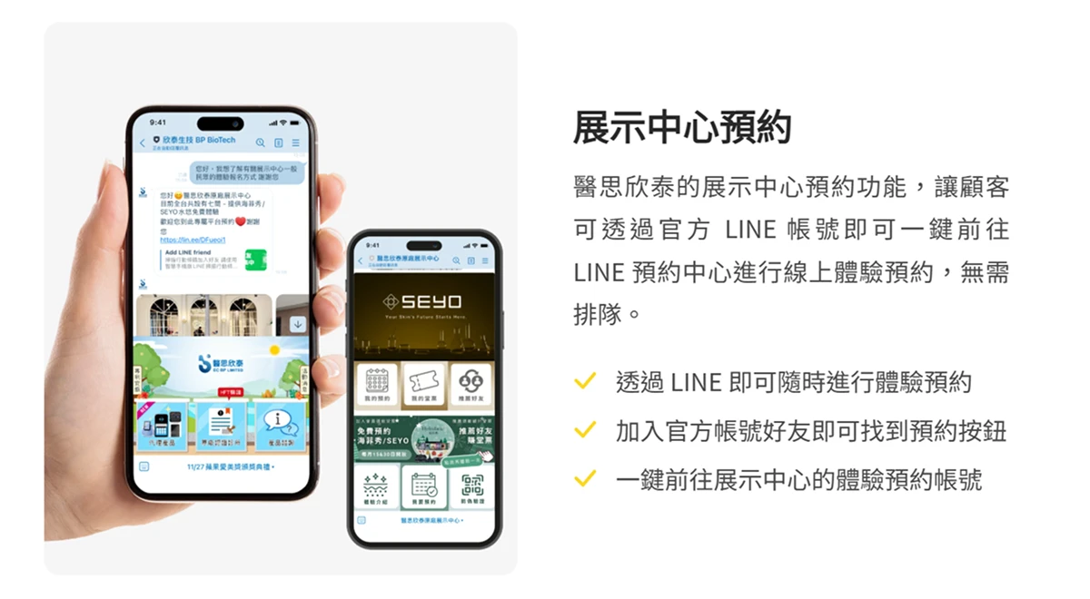 醫思欣泰鑑於消費者、醫美診所對於臉部美容儀器,諸如水飛梭、海菲秀體驗及 SEYO 體驗的潛在需求,在展示中心的 預約體驗 中,採用 美業歐巴 LINE 預約系統。加入醫思欣泰官方 LINE 帳號好友後,顧客即可在 LINE 聊天室中直接找到預約按鈕,一鍵連結至專屬的 展示中心預約體驗 LINE 官方帳號,加入會員後即可馬上預約,不需再透過繁瑣電話或繁複表單,大幅減少等待及排隊時間。
