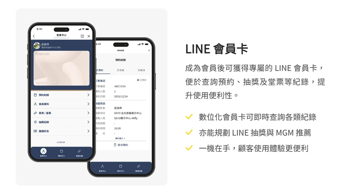 一是大幅提升使用便利性。消費者僅需加入 LINE,無論是水飛梭服務還是最新 SEYO 體驗,一鍵即可完成 預約、核銷堂票、查詢餘額、參與互動,從預約端到後台管理均無縫接軌。
