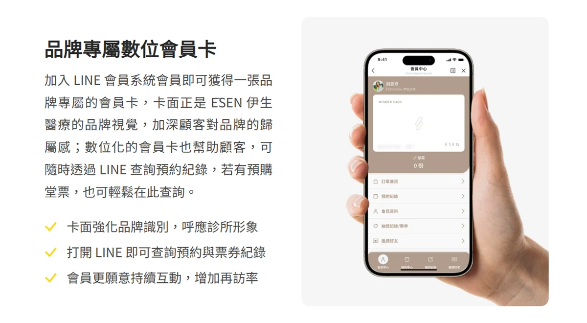 除了預約功能外,ĒSEN 也善用 LINE 的 會員機制,讓每位顧客加入 LINE 會員後即自動生成品牌專屬的 數位會員卡。卡面設計延續診所的品牌識別,結合柔和色調與醫療質感,強化了顧客對 ĒSEN 的印象。