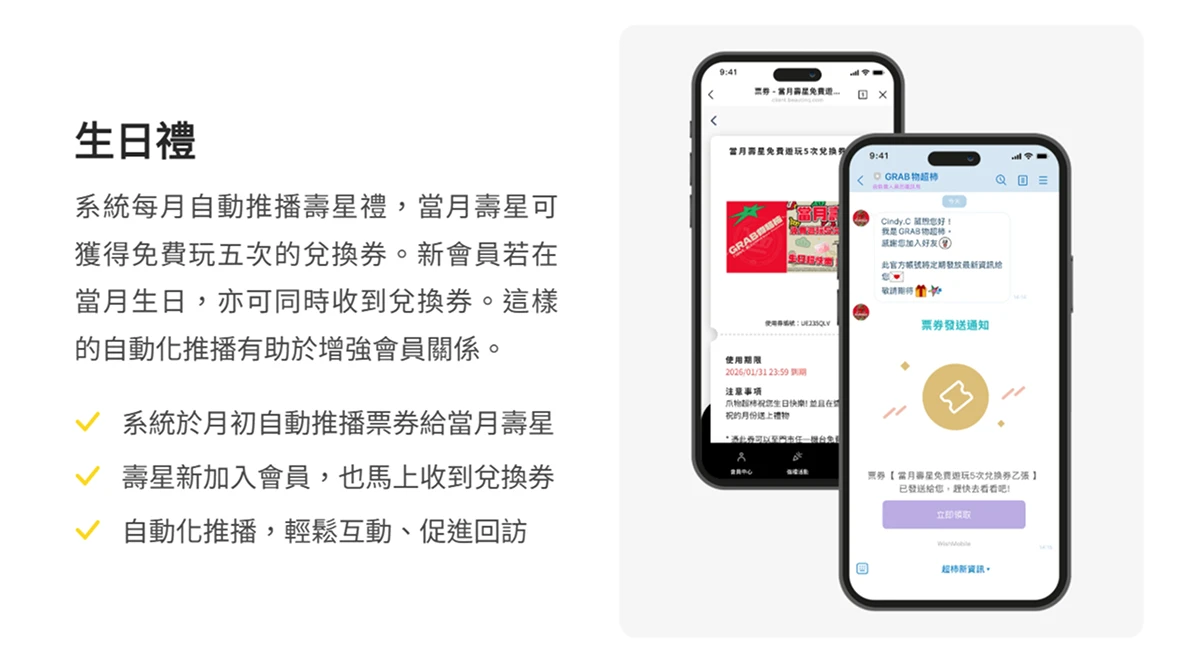 壽星行銷為夾娃娃機店常用策略之一,但如果要仰賴人工處理往往容易人為疏漏、流程不一致。生活歐巴 LINE 會員系統在每月月初會根據會員資料自動推播 生日禮,這些票券會直接匯入當月壽星的數位會員帳戶,新會員若恰逢生日月份也能即時收到。