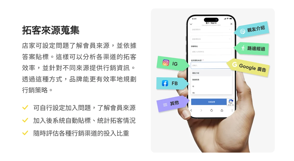 夾娃娃產業之所以能夠規模擴大,與有效的 行銷推廣 息息相關。爪物超柿攜手生活歐巴設計自定義問題模組,用以判斷會員來源 ( 例如:是通過親友介紹、路邊經過、社群廣告,還是 Google )。每一位新會員加入後,系統自動進行 貼標 與統計。經營團隊能即時分析每個渠道帶來的實際客流、成為實質消費會員的 轉換率,進而評估資源投入效益,動態調整行銷預算的配重。