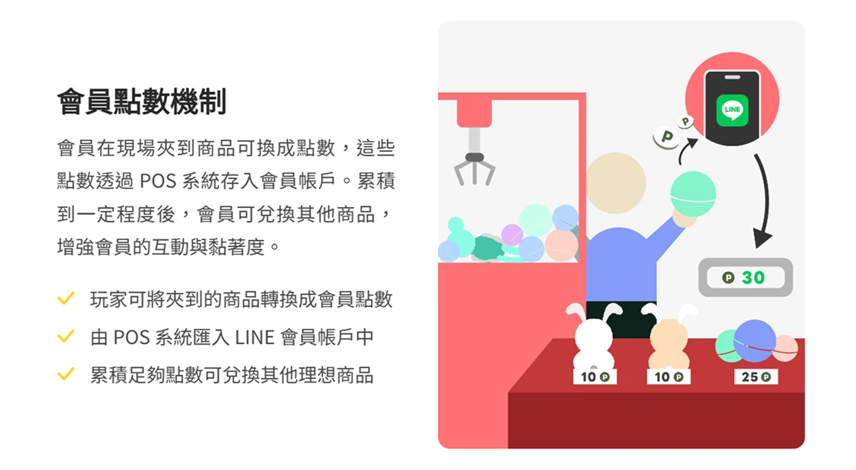 這種全數位整合運營,不僅突破紙本集章的效率瓶頸,也讓玩家有明確的累積與回饋目標。整合 POS 系統後,玩家不論消費哪種娃娃機台,都能在獲得獎品後,轉換成點數存入帳戶,也能即時查閱更新,減少對店員詢問的時間,提升現場消費流暢度。無論哪種娃娃機台類型、哪些戰利品、換成多少點,一目了然,打消會員疑慮、提升消費信心。