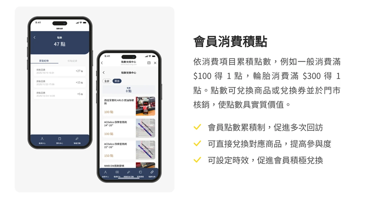 在 會員經營 端,數位會員卡、會員分級、新會員註冊禮與生日加碼回饋金,則讓每一次台北換輪胎或車輛維修,都有對應的回饋被記錄在帳戶中。再搭配 電子票券 與 會員消費積點,輪胎館可以設計不同檔期活動,例如:針對底盤維修推出限定點數加倍、或在特定月份鼓勵車主安排車輛保養。這些行銷工具並不是轟炸式發送,而是根據會員資料與過往換輪胎、車輛維修的紀錄,挑選適合的族群溝通,讓門市實際營運感受到「少一點打擾、多一點剛剛好」的深度互動。