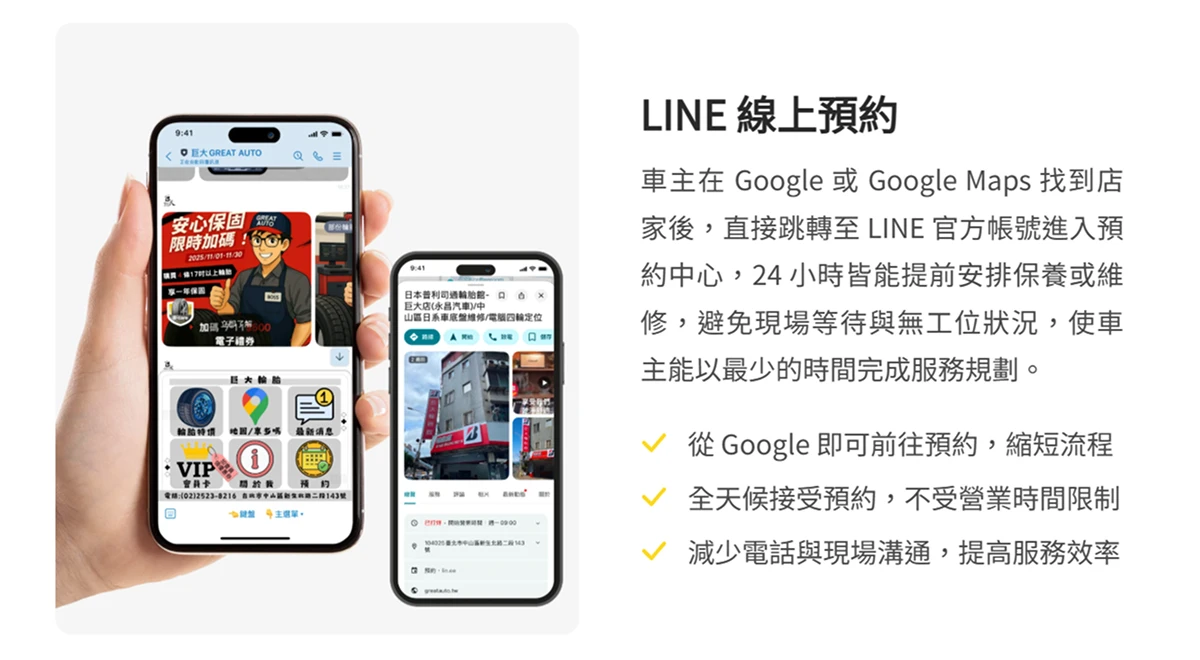 在這個預約中心裡,巨大輪胎把輪胎館實際提供的服務,拆成車輛保養、車輛維修、底盤維修以及台北換輪胎等項目,依照需求選擇之後,就能看到可預約的時間區間。對車主而言,最大的改變是:不需要再為了底盤維修臨時繞去店裡排隊,更不用擔心台北換輪胎到了現場才發現工位已滿。對店家來說,生活歐巴 協助輪胎館把電話分流到 LINE,把原本混雜的預約資訊,變成清楚的時間表,也讓現場能更專注於真正的車輛保養與車輛維修。當「 搜尋完就能直接預約 」變成標配,台北換輪胎這件看似瑣碎的事情,反而成了巨大輪胎與車主建立信任的起點。