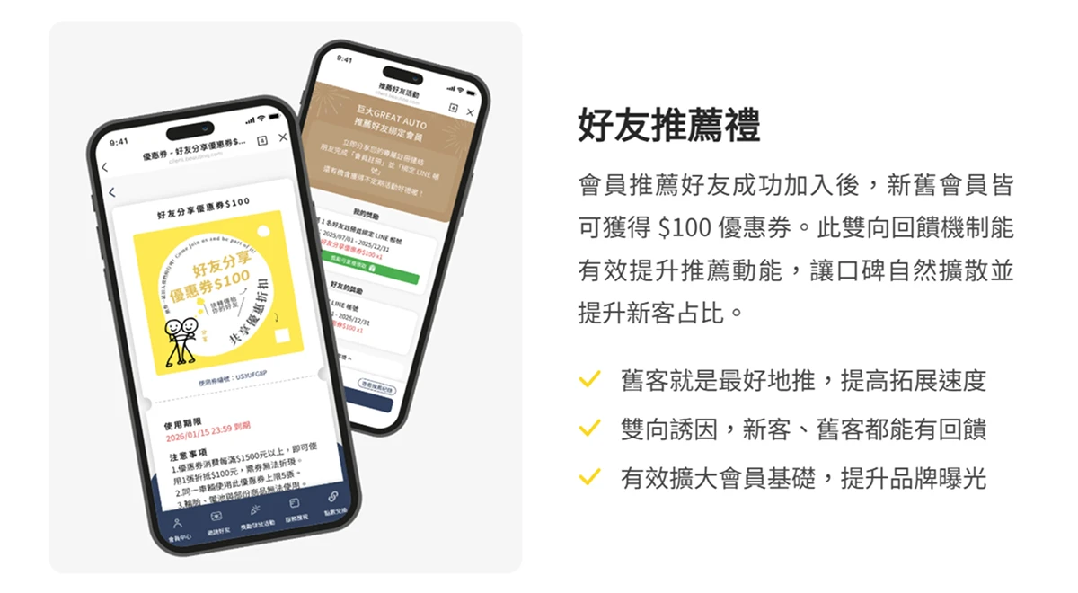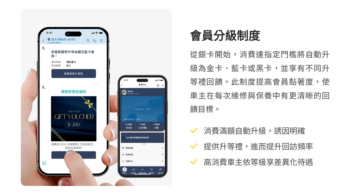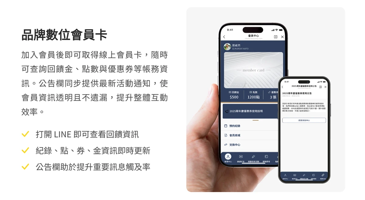 數位會員卡 則把點數、回饋金與各式優惠券集中在同一個入口,車主只要打開 LINE,就能看到過去在輪胎館累積的回饋,無論是先前一次換輪胎拿到的點數,還是前次車輛維修得到的優惠票券,都能清楚掌握。搭配 會員分級、註冊禮、生日回饋金 與 好友推薦等 會員行銷 機制,巨大輪胎不再只是在某個時點處理車輛保養,而是持續以不同形式提醒車主:什麼時候該檢查底盤維修、什麼時候該思考下一次台北換輪胎,進而把一次性交易,轉化成穩定的 會員經營關係。