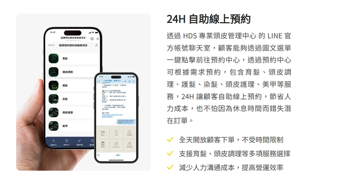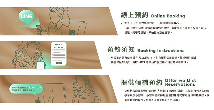 有顧客分享,她過去常常想到要預約頭皮保養,卻因為時間太晚、店家已經下班而無法馬上聯繫店家,只能隔天再打電話,經常因此錯過最佳時段。自從 HDS 專業頭皮管理中心導入 LINE 預約系統、採用線上的預約制後,她就算在晚上十一點進行預約,也能順利在想要的時間如願到店,不僅感受到便利,也增加了對品牌的好感。這樣的故事在美業或是眾多的服務性質店家中並不少見,顯示數位化預約已逐漸成為顧客習慣,甚至成為影響消費決策的重要因素。