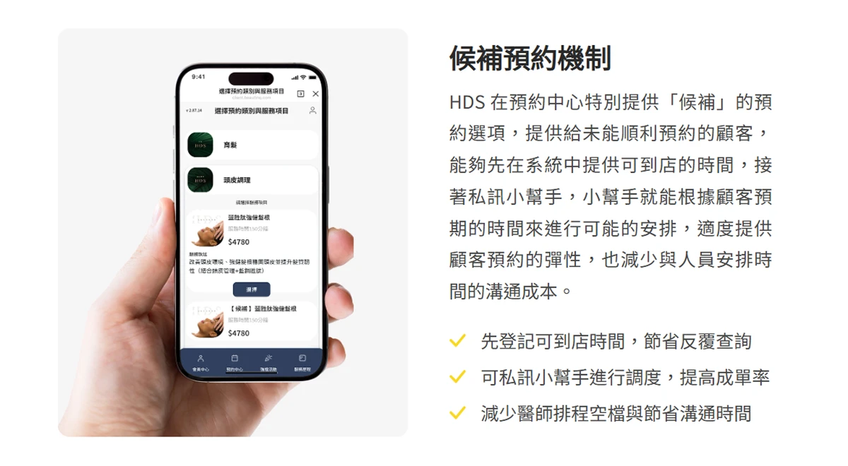 頭皮管理與育髮服務往往在特定時段需求集中,熱門時段經常一位難求。若直接告訴顧客「已額滿」,往往會導致潛在顧客的需求流失。HDS 專業頭皮管理中心則利用「候補預約」的機制,讓顧客可以先留下可到店時間,再私訊小幫手、由小幫手協助調度 預約排程。這樣的設計,讓顧客知道即使沒搶到熱門時段,也還有機會獲得安排。