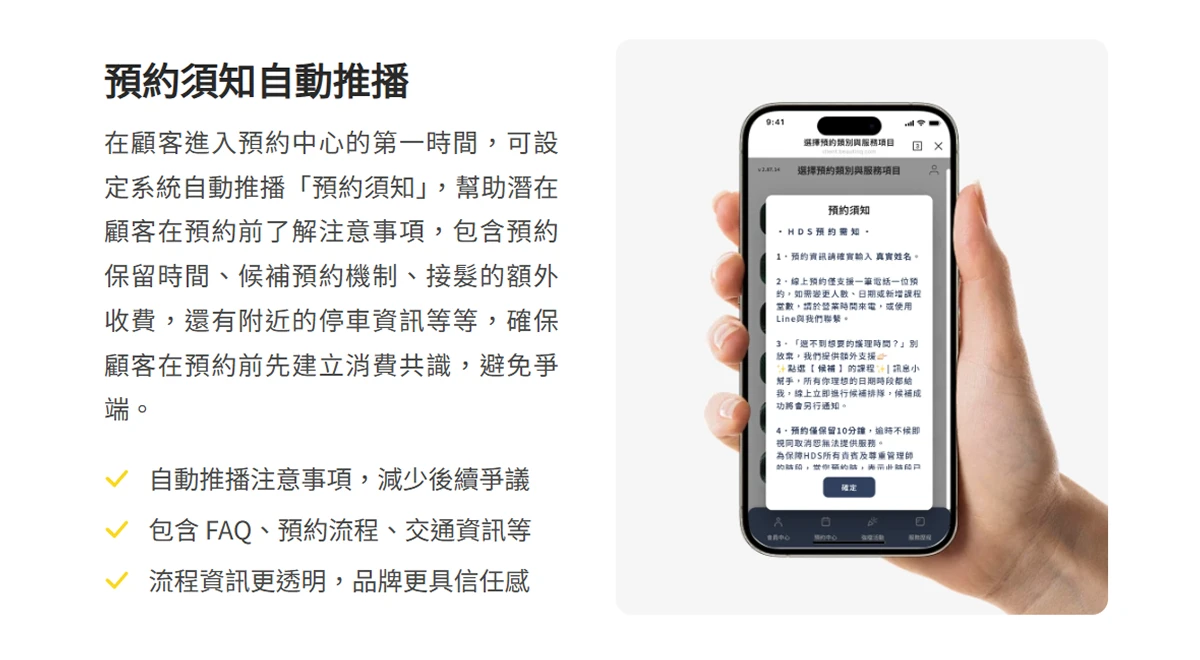 ( 圖:自動化推播的預約資訊,讓顧客第一時間了解預約規則,優化 顧客體驗 )