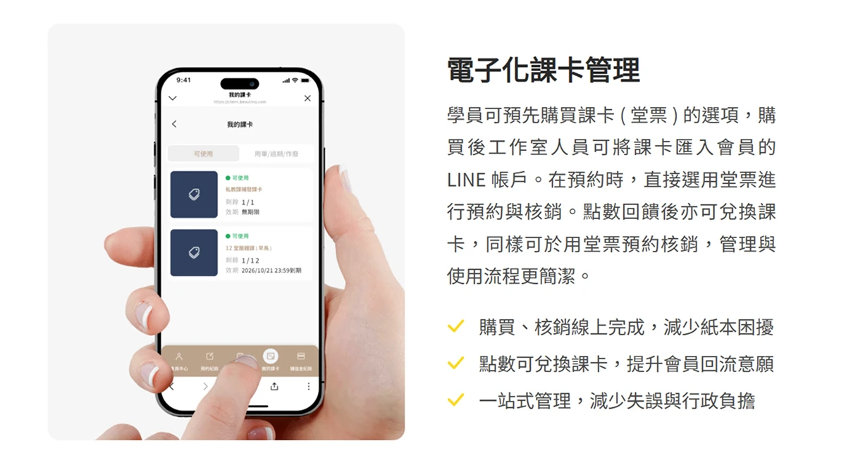 傳統的課卡往往需要紙本記錄,不僅容易遺失,也造成管理混亂。Kalos Pilates 將課卡全面數位化,學員在購買後由工作室人員直接匯入 LINE 帳戶,往後只需在預約時根據 堂票 ( 課卡 ) 預約,即可完成課程核銷。
