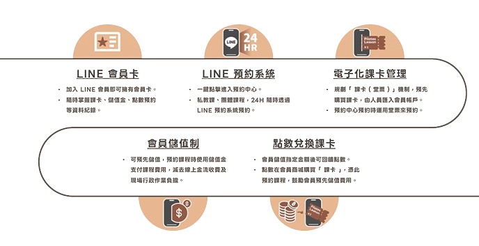 學員在加入會員時,只需透過 LINE 官方帳號 進入聊天室,就能填寫包含運動目的、健康狀況與品牌來源的表單,讓教練團隊在課前就能了解學員需求並提供更精準的課程建議。完成加入後,學員即可在 LINE 會員中心即時查看課卡、儲值金、點數餘額與預約紀錄,不必額外下載其他 APP 或登入網站。