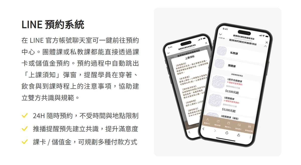在 線上預約 課程的過程中,系統還會自動跳出「上課須知」提醒,包括穿著規範、飲食建議以及課程準時到場的注意事項,幫助建立雙方共識,降低臨時狀況。無論是一對一私教還是小班團體課程,學員都能透過 堂票 或 儲值金 完成付款,達成 24 小時不間斷的便利預約體驗。對於工作室而言,這套整合流程不僅提升會員滿意度,更有效降低現場行政作業與金流手續成本,帶來營運效率的全面提升。