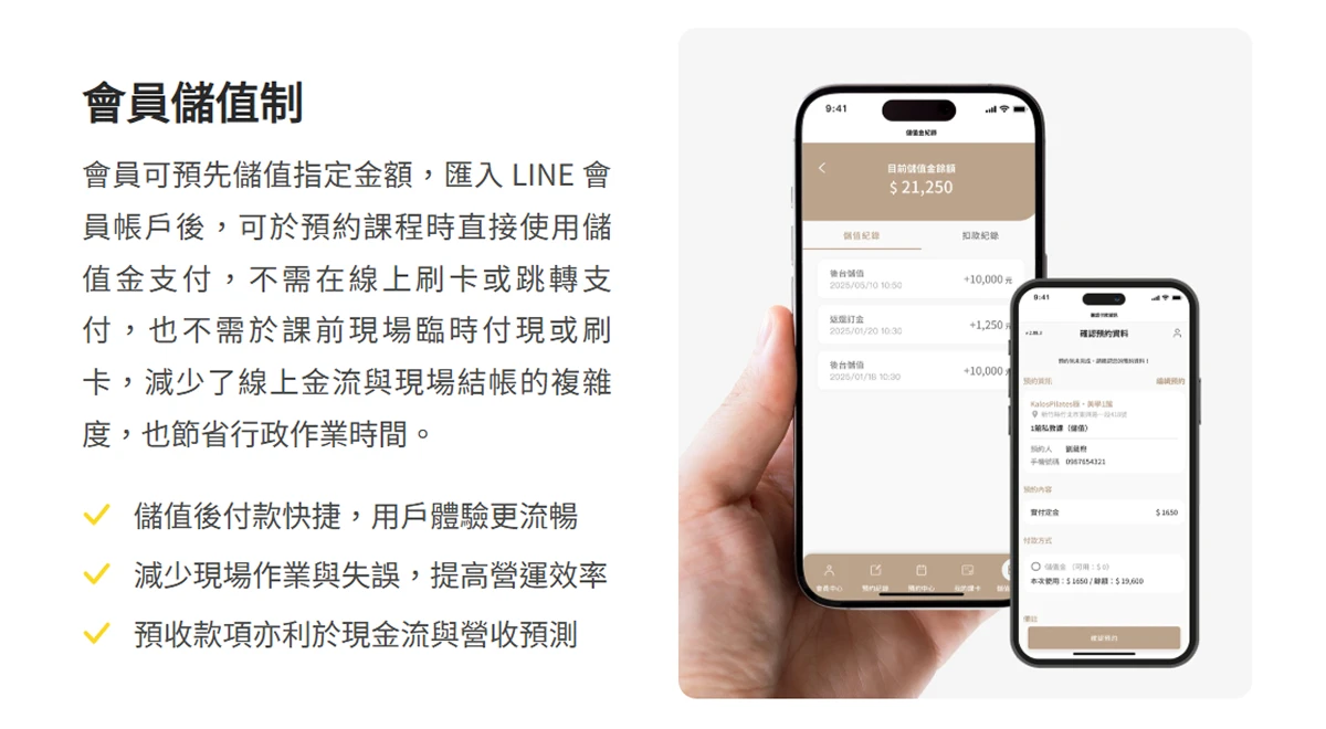除了課卡外,Kalos Pilates 也透過 會員儲值制 鼓勵學員提前消費儲值。會員可在到店了解過環境後,臨櫃 預先儲值,而後由工作人員將儲值金匯入 LINE 會員帳戶,往後預約課程時直接扣抵,省去了每堂課刷卡或付現的麻煩。