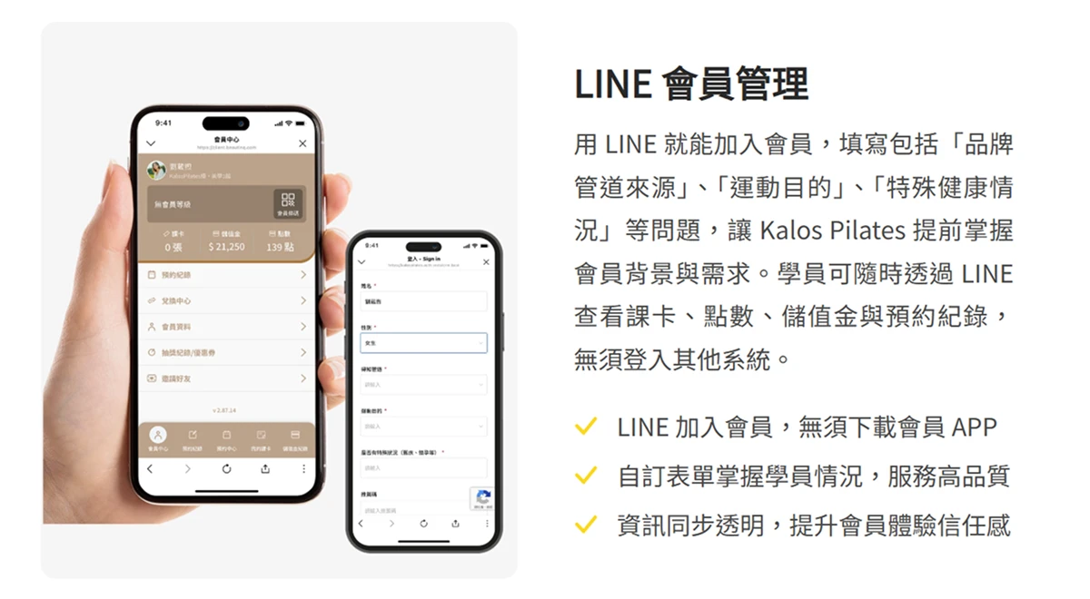 Kalos Pilates 極‧美學透過 生活歐巴 LINE 預約與會員 CRM 系統,不僅簡化了會員管理與課程預約流程,更透過課卡電子化、會員儲值與點數回饋打造完整的會員循環。這套機制讓學員體驗更便利,品牌經營更穩健,在競爭激烈的竹北皮拉提斯市場中脫穎而出。