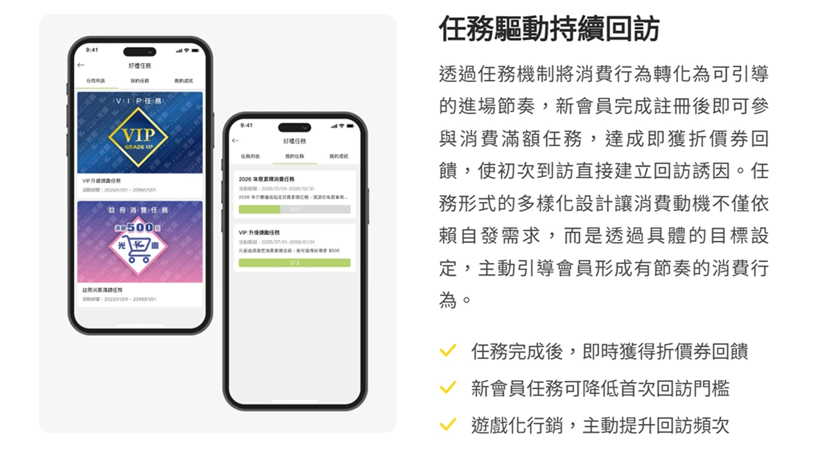 從管理層的角度,當越來越多的回訪行為是透過任務節奏被觸發,年度營收曲線便更趨平滑,品牌的業績表現不再完全被大型促銷檔期左右,而是建立在穩定的會員互動節奏之上。任務機制 的可設計性,也使品牌在不同季節與不同客群目標之間,能靈活調整誘因設計,使會員活躍度的維繫具備更強的可操作空間,而非被動等待外部市場節奏驅動。