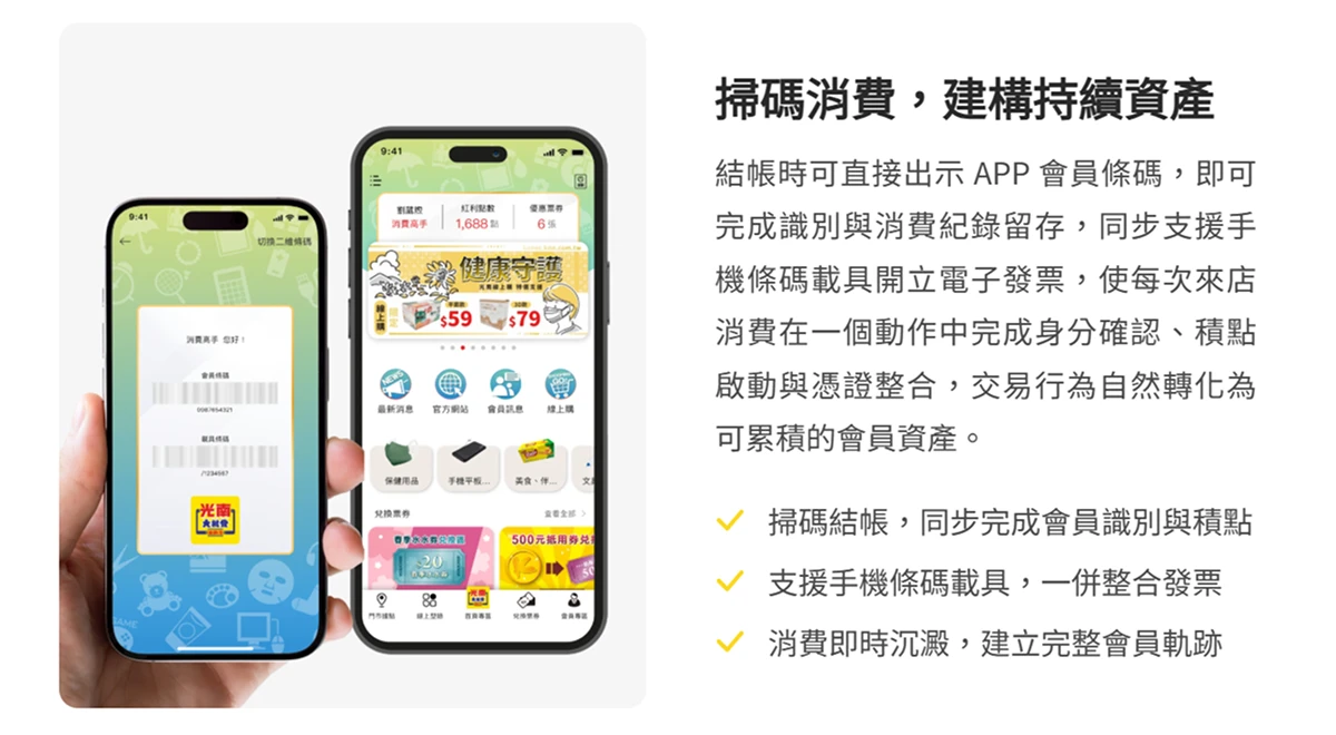 對連鎖零售品牌而言,最關鍵的識別節點就是結帳的當下。光南好站 APP 讓會員在結帳時直接出示條碼,即可完成身分識別與消費紀錄留存,無需額外操作,積點啟動 與憑證整合在同一個動作中同步完成。這種識別機制的設計,讓每一次來店消費都不再停留於單次交易的金流記錄,而是在 會員帳號 下形成可被觀察、可被延續的消費痕跡。APP 同步支援手機條碼載具,讓 電子發票 的開立與會員識別在掃碼的瞬間一併完成,不需要消費者在結帳流程中進行額外切換,使整體結帳體驗更為流暢,也讓消費者在日常使用中自然養成出示 APP 條碼的習慣性動作。