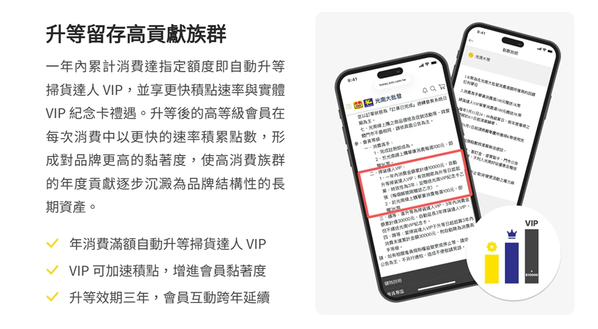 在光南好站 APP 的會員架構中,完成註冊即成為消費高手等級的基礎會員,而一年內累計消費達到指定額度,便可自動升等為掃貨達人 VIP,有效期長達三年,並享有更高倍率的積點速率與實體 VIP 紀念卡禮遇。這套 升等制度 的核心設計邏輯,在於讓消費者在累積進度可見的前提下,自然形成在光南大批發集中消費的傾向,進而在整體會員結構中逐步強化 高貢獻族群 的占比。