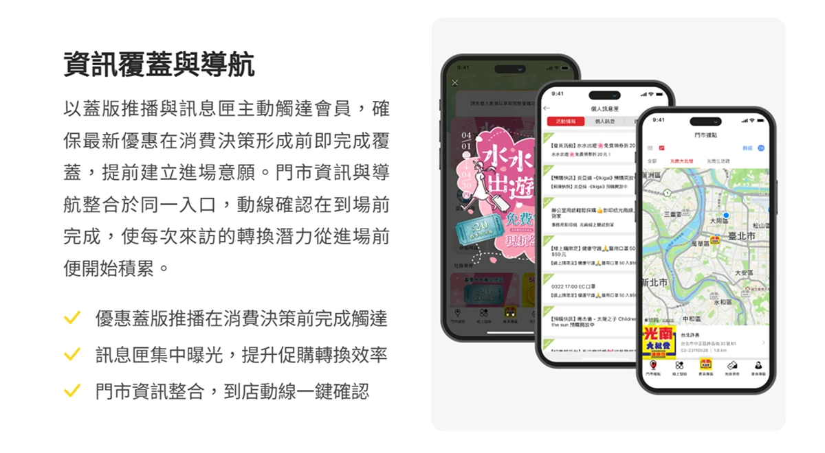 訊息匣 的設計進一步讓各類活動資訊、品牌公告與優惠內容集中於同一入口,消費者不需要在不同渠道之間搜尋拼湊,而是在單一介面中完成資訊全覽。對光南大批發而言,這種集中曝光的效益不僅在於提高觸及率,更在於縮短了優惠資訊從被看見到產生實際來客轉換之間的路徑距離。與此同時,APP 內建的門市資訊查詢與導航功能,讓消費者在確認進場意願之後,能夠即時找到最近的光南大批發門市並完成 O2O 動線 規劃。