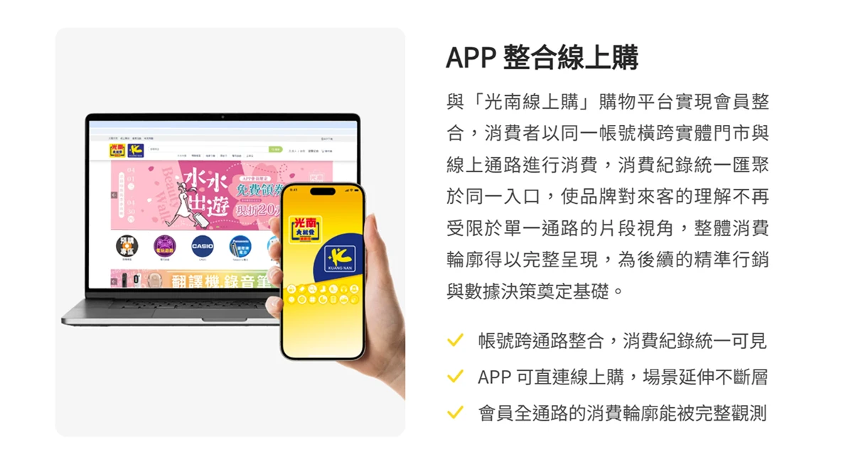 「光南線上購」平台的發展,讓光南大批發的消費場景從 實體門市 延伸至 線上通路,消費者可以在不同時間、不同場景中完成選購。這種延伸是品牌成長的重要支撐,但也帶來了更深層的整合需求:若 APP 與線上購的會員帳號及消費數據未能打通,消費者在不同通路的行為便形成各自獨立的片段記錄,品牌所能觀察到的,永遠只是單一通路的截面,而非同一位顧客的完整消費輪廓。