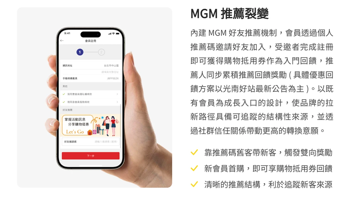 光南好站 APP 內建 MGM 好友推薦 機制,會員透過個人推薦碼邀請好友完成註冊,受邀者可獲得購物抵用券作為入門回饋,推薦人同步累積對應的推薦獎勵 ( 具體優惠方案以 光南大批發 最新公告為主 )。這套設計讓品牌的新客來源從單向的廣告投放,延伸為以既有會員為媒介的 社群裂變 路徑,使每一位現有會員都潛在地成為品牌成長的自發動能。