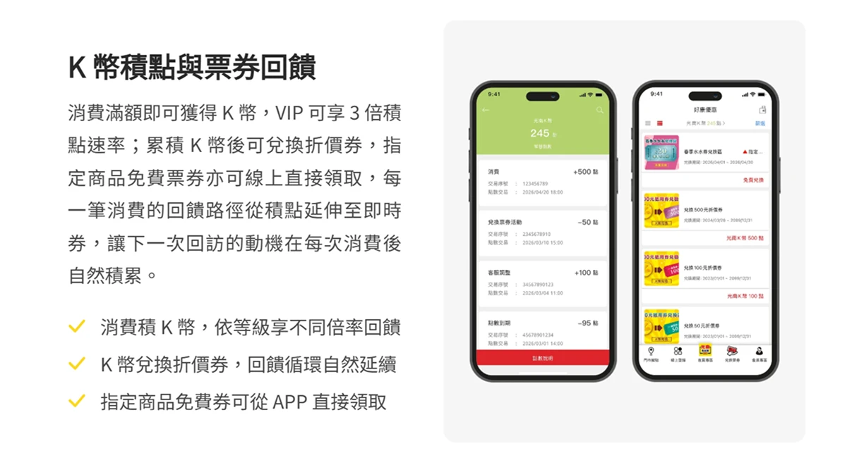 K 幣的兌換機制進一步讓積累的回饋轉化為具體的消費誘因。會員可將累積的 K 幣兌換為 折價券,在後續消費中直接折抵,使每一輪積點都自然指向下一次回訪。指定商品的免費優惠票券亦可直接從光南好站 APP 線上領取,不需等待現場發放,即時性的取得方式讓優惠的觸及效益更完整,也使消費者在離開門市後仍持續與品牌保有資訊連結。