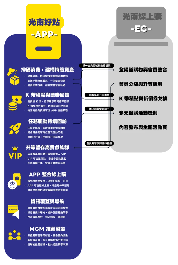 在這樣的背景下,光南大批發推出「光南好站」APP,以統一的會員入口整合實體門市與線上購的消費行為,讓每一次到訪、每一筆交易、每一個回饋環節,都在同一個帳號架構下持續累積。這不是技術功能的簡單疊加,而是一種讓品牌能真正理解顧客、延伸顧客關係 的系統性結構轉變,使光南大批發從「到訪即結束」的單次交易邏輯,走向「每次到訪都是下一次回訪起點」的長期會員經營框架。