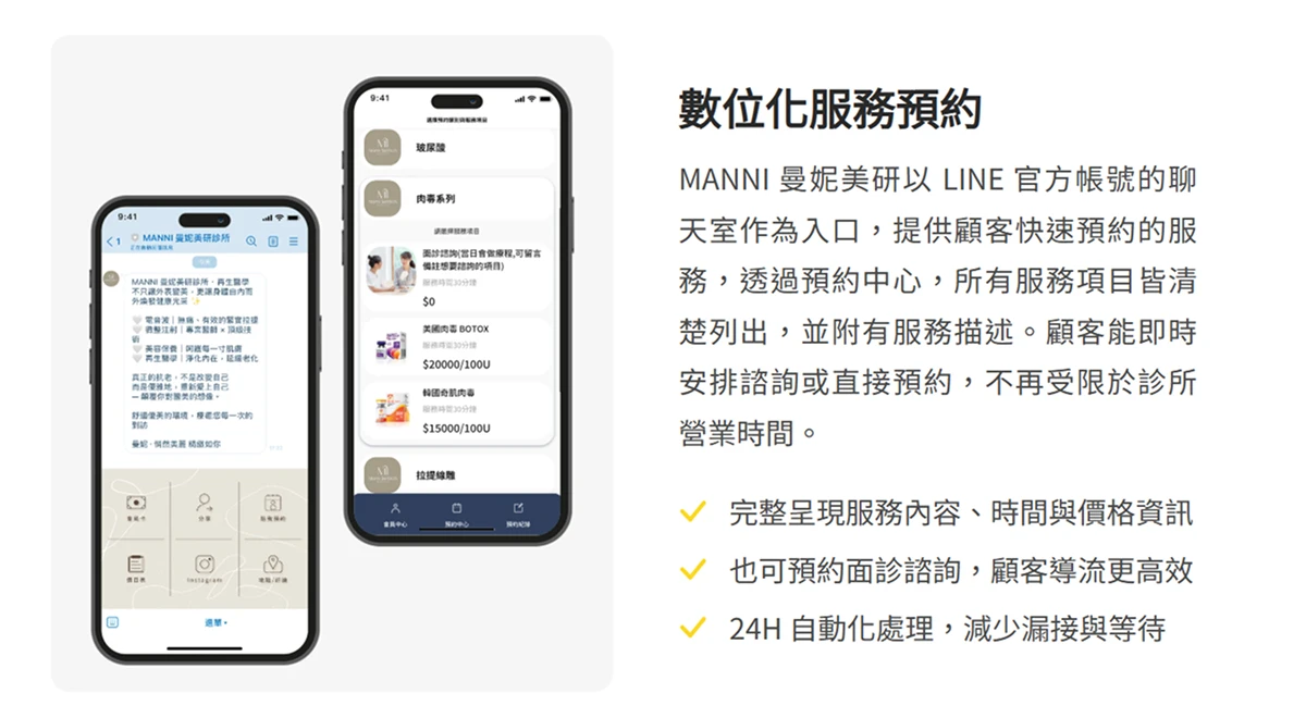 透過 LINE 預約系統 的導入,MANNI 曼妮美研診所不僅提升了內部管理效率,也在顧客體驗上創造新價值。顧客能隨時完成預約、查詢紀錄,並在北屯醫美診所林立的環境中,感受到這間診所帶來的便利與專業。