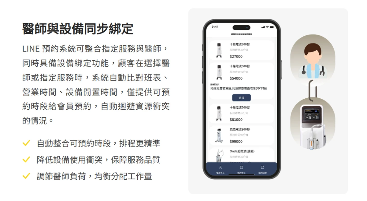 在醫美診所的營運中,常見的挑戰之一是設備與醫師資源的安排。某些療程需要特定儀器與專科醫師同時配合,如果人工管理,很容易出現衝突或重複排程。MANNI 曼妮美研導入 LINE 預約系統 後,當顧客在 預約 時選擇指定醫師或療程,系統會自動比對醫師班表、營業時間與設備閒置狀況,僅顯示可用時段。