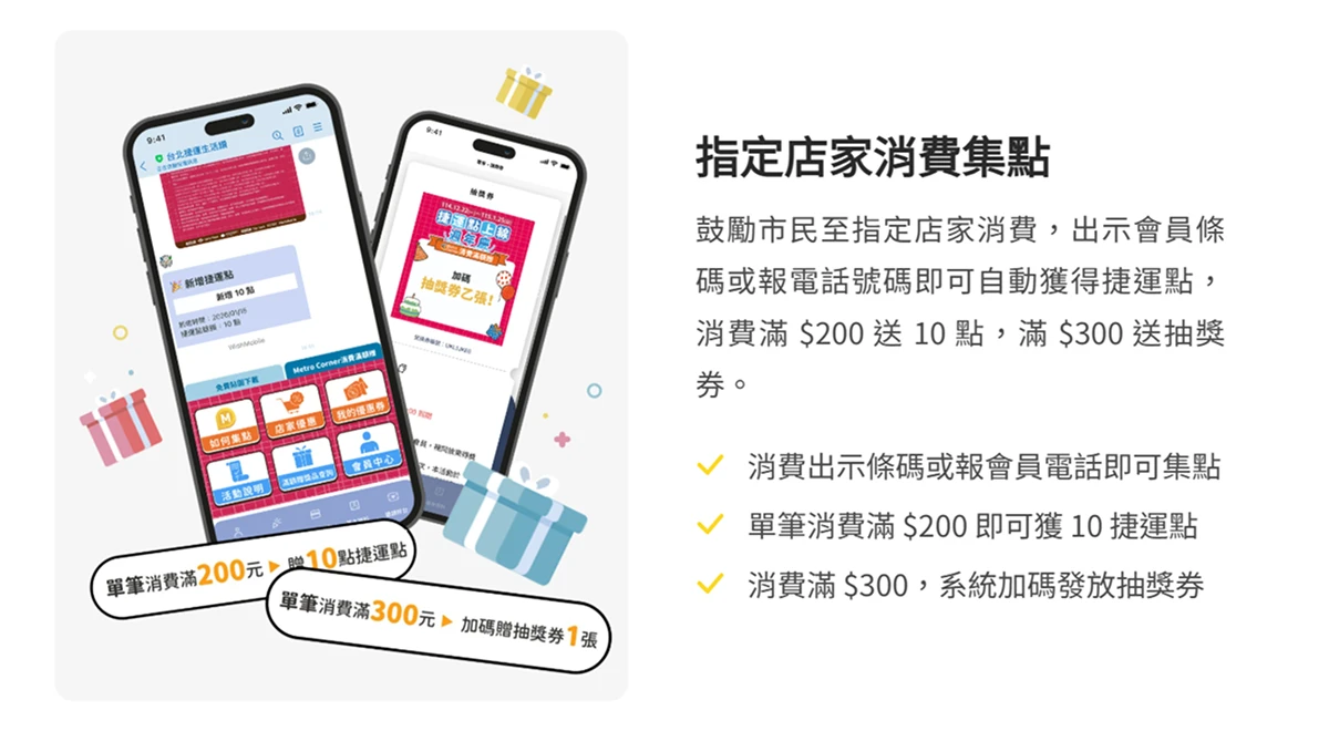 要強化會員對生活圈的參與感,台北捷運聚焦於 消費集點 的實體應用。會員於指定店家消費時,只要出示 LINE 會員條碼或報手機號碼,即可自動累積點數。購物滿 200 元即送 10 捷運點,滿 300 元除點數外,還會自動獲得滿額抽獎券,刺激高額消費。
