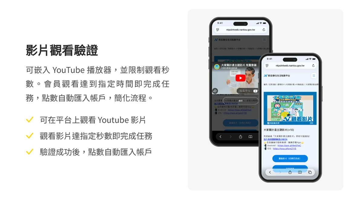 南投數位生活點數平台嵌入 YouTube 播放器,並 設定觀看秒數 驗證條件。參與者觀看政策宣導短片或地方導覽影片,達到規定時間後,即完成集點任務,系統隨即自動發放點數。